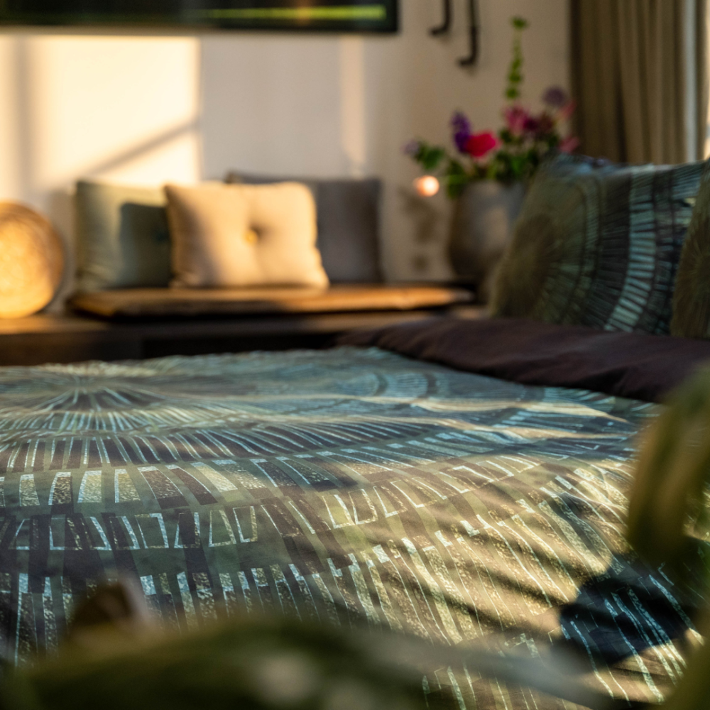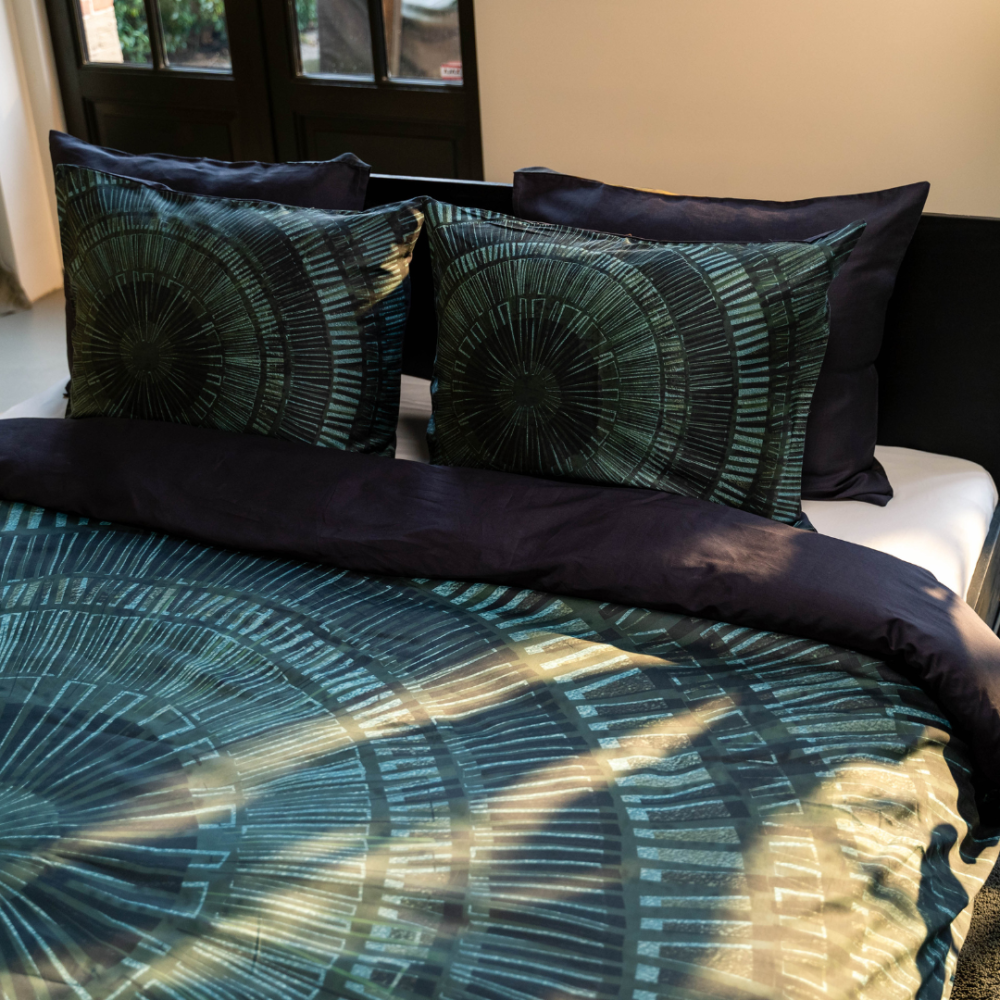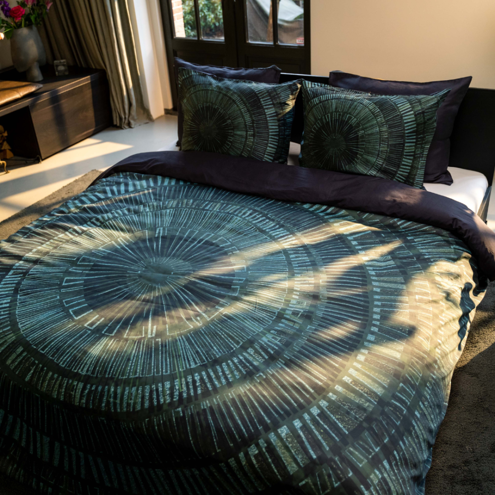 Denna coola design drar bokstavligen dina ögon rakt in i centrum. Mörkgröna och gråa toner möts i denna abstrakta, grafiska design. Ett tryck som inte skulle se malplacerat ut i industriella, tuffa interiörer eller som en snygg kontrast i ett ljust rum. Detta påslakan är tillverkat av 100% egyptisk bomullssatin. Detta gör lakanet inte bara extremt starkt utan också väldigt smidigt och mjukt. Tack vare de släta fibrerna i kombination med satinväven är detta påslakan skonsamt mot hud och hår. Baksidan av påslakanet är svart.